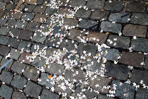 29 février 2012, par François BonJe n’ai jamais aimé les puzzles, sauf dans La vie mode d’emploi de Perec, mais parce qu’il s’agit plus de théorie du puzzle. Et de la construction de sa difficulté graduée. Sur cette belle vieille place de Bruxelles que je me retrouve à traverser, les morceaux renversés d’un puzzle. Pour qu’on l’affronte, il faut être sûr qu’ils soient tous rassemblés : a priori, là, c’est impossible. On ne recomposerait que des fragments éclatés, des parcelles de réalité. J’ai pris la photo comme ça, en (…)