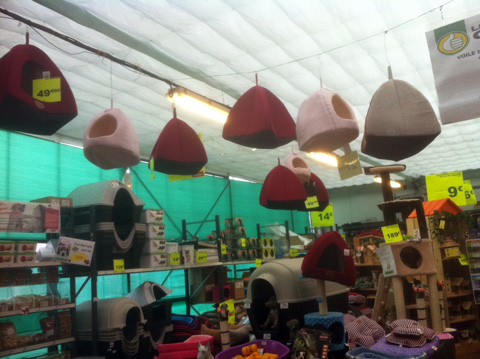 22 décembre 2011, par François BonC’est une bonne idée qu’ils ont eue, à la jardinerie d’Auchan Saint-Cyr sur Loire : pendre ses chats au plafond, pour 49 euros seulement. Et ayez autant de chats que vous voulez. Ils ne vous embêteront plus, vous les nourrirez à l’aide d’un bâton pour leur mettre à portée un oiseau frais ou l’habituelle compote aux farines animales en boîte. On a des versions pour chats transportables, c’est la mode dans les trains ces jours-ci. Et des versions pour chiens miniatures, mais ils supportent (…)