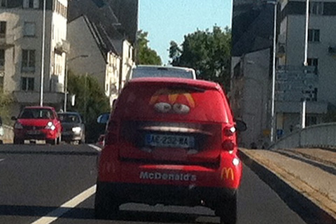11 septembre 2011, par François BonSuivi longtemps cette voiture, avant-hier : c’est juste qu’on allait dans la même direction et qu’on était dans les embouteillages de la reprise d’après vacances. On est gavé de publicité partout, mais c’est principalement des panneaux, qui bougent, clignotent, s’alignent, avec des slogans si possible le plus idiot possible. Ici pas de slogan, mais c’est comme les anciens hommes sandwich (d’ailleurs c’est une publicité pour les gros gras sandwiches du McDonald’s) l’objet lui-même qui est (…)