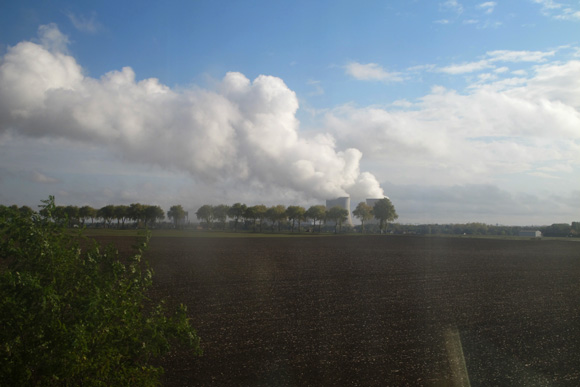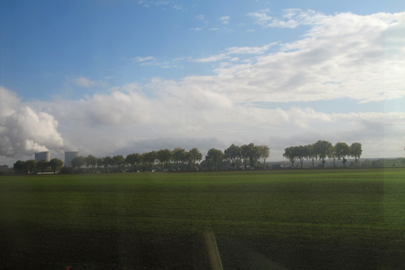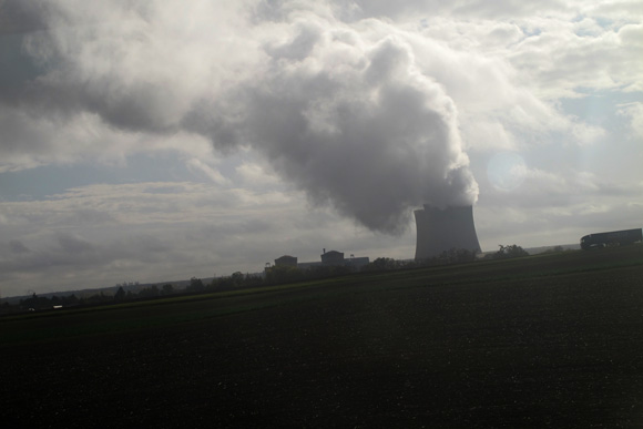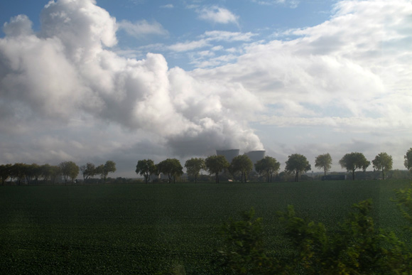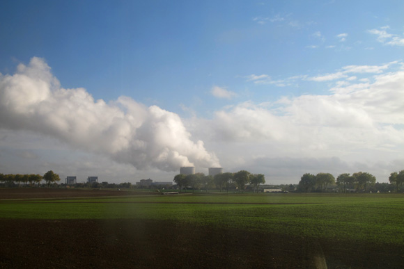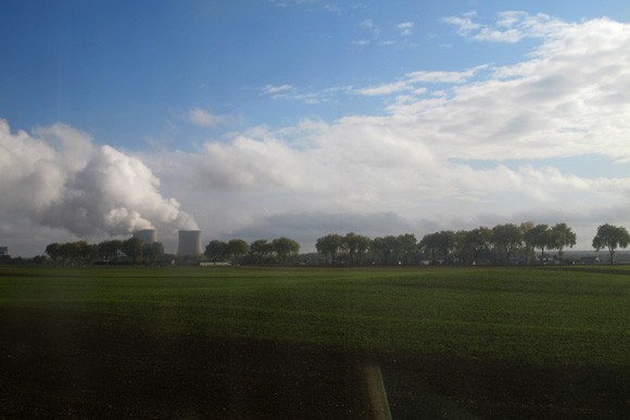 J’en extrais ce moment de contournement de la centrale elle-même, avec comme à Chinon les arbres qui fument, et la colonne de vapeur des refroidisseurs passant lentement d’arbre en arbre à mesure que le train avance.