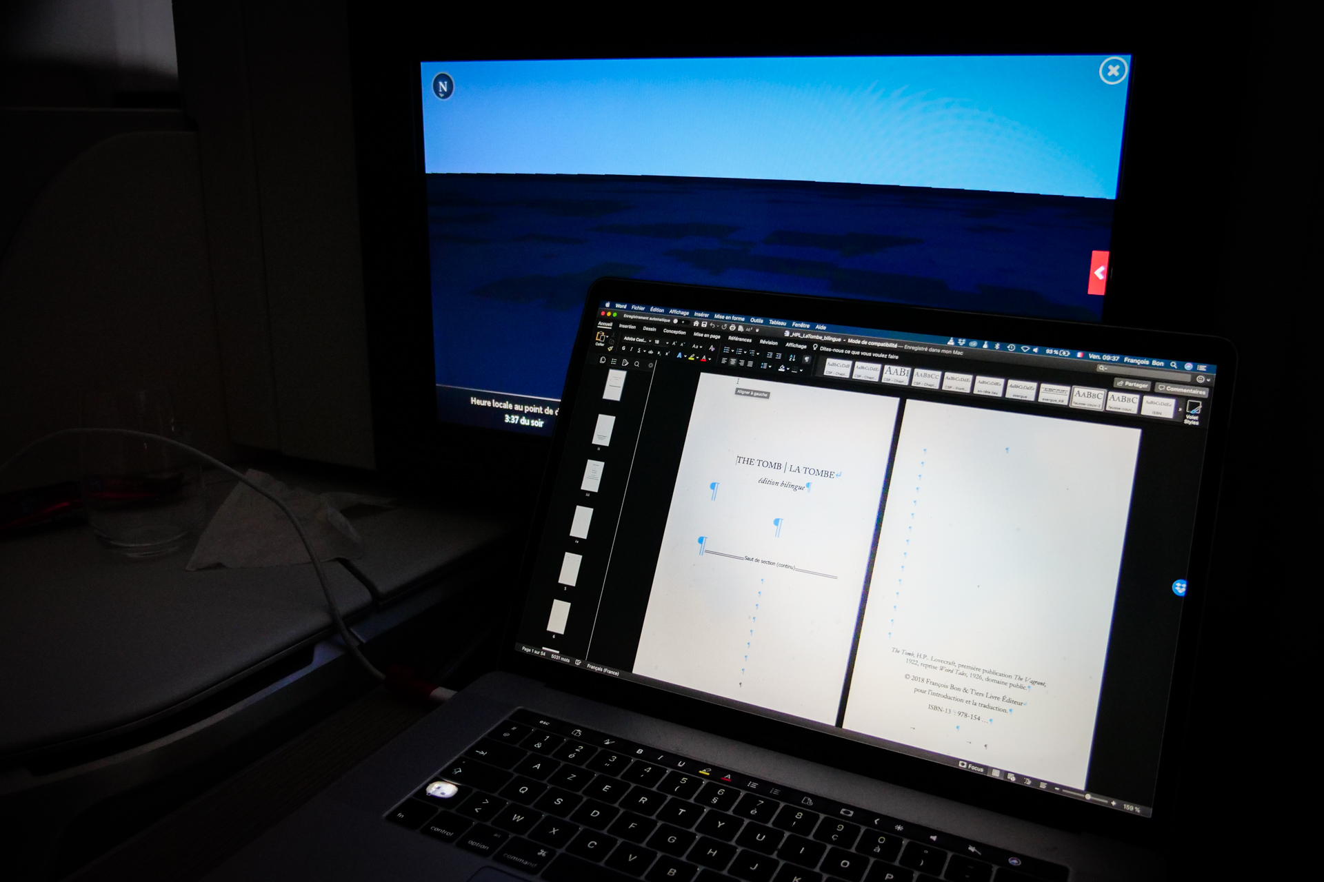 Le terme de classe, pour ceux de ma génération, c’est surtout associé à lutte des. Alors quand votre carte d’embarquement affiche soudain, au moment de monter dans l’Airbus, la mention Invalide on panique un peu mais non. L’arrière a été survendu m’informe-t-on, et comme un vendredi 2 août il n’y a pas beaucoup d’hommes d’affaires à bord (un seul, en classe de, et qui fera bien sentir sa réprobation silencieuse), me voilà avec d’autres surclassé, et on a droit au grand jeu, repas avec nappe etc. Mais c’est surtout le confort qui change tout. De la place pour les jambes, de la place pour les coudes, un fauteuil qui est un fauteuil (ô les navettes Air Transat, là c’est Air Canada), plus la prise de courant. Et donc pour les 7h de trajet, te voilà comme dans un petit bureau plein ciel. Ça change quoi : fin de la promiscuité. J’alterne mes paragraphes du Lovecraft en cours avec des lampées des Furtifs de Damasio sur le Kindle. Pas dormi, sinon 2 petits moments. Alors tu gamberges. J’ai laissé l’écran sur l’animation avec progression du chemin : le nom des fonds marins, le défilé des villes et des fuseaux horaires tout autour de la vieille planète. Conscience qu’on l’use tant trop : à Roissy, ce matin, dans la longue migration vers les portes d’enregistrement, sécurité, embarquement, cette impression qu’une aventure si récente et exceptionnelle est ravalée à l’usage de masse. Mais sans culpabilité : si on doit travailler sur ces questions, bien la nécessité de le faire ensemble. Amérique ou Europe, ou Asie, j’ai besoin de tout parce que j’appartiens à ce tout.