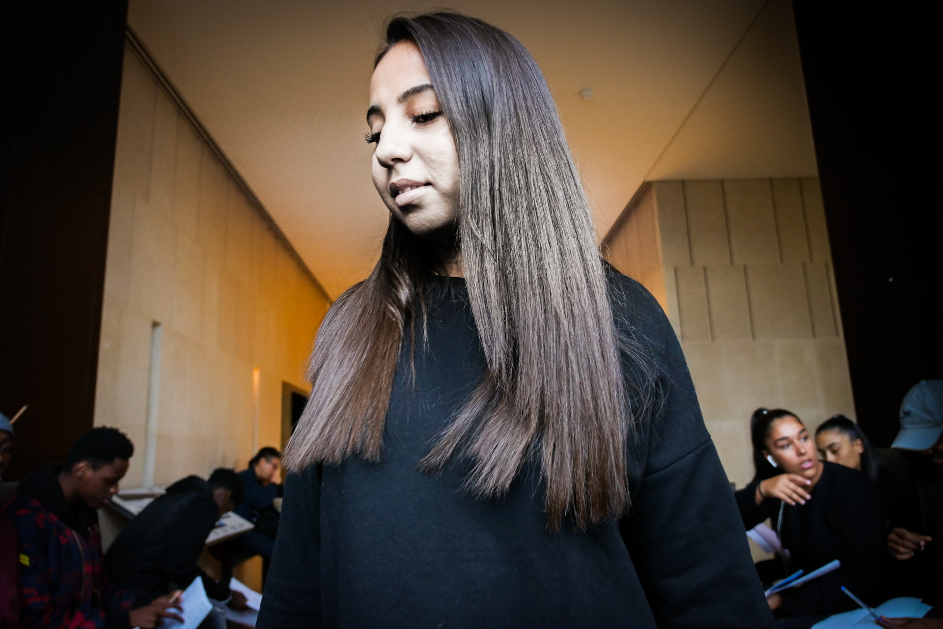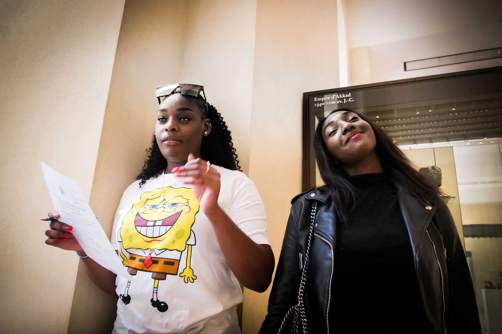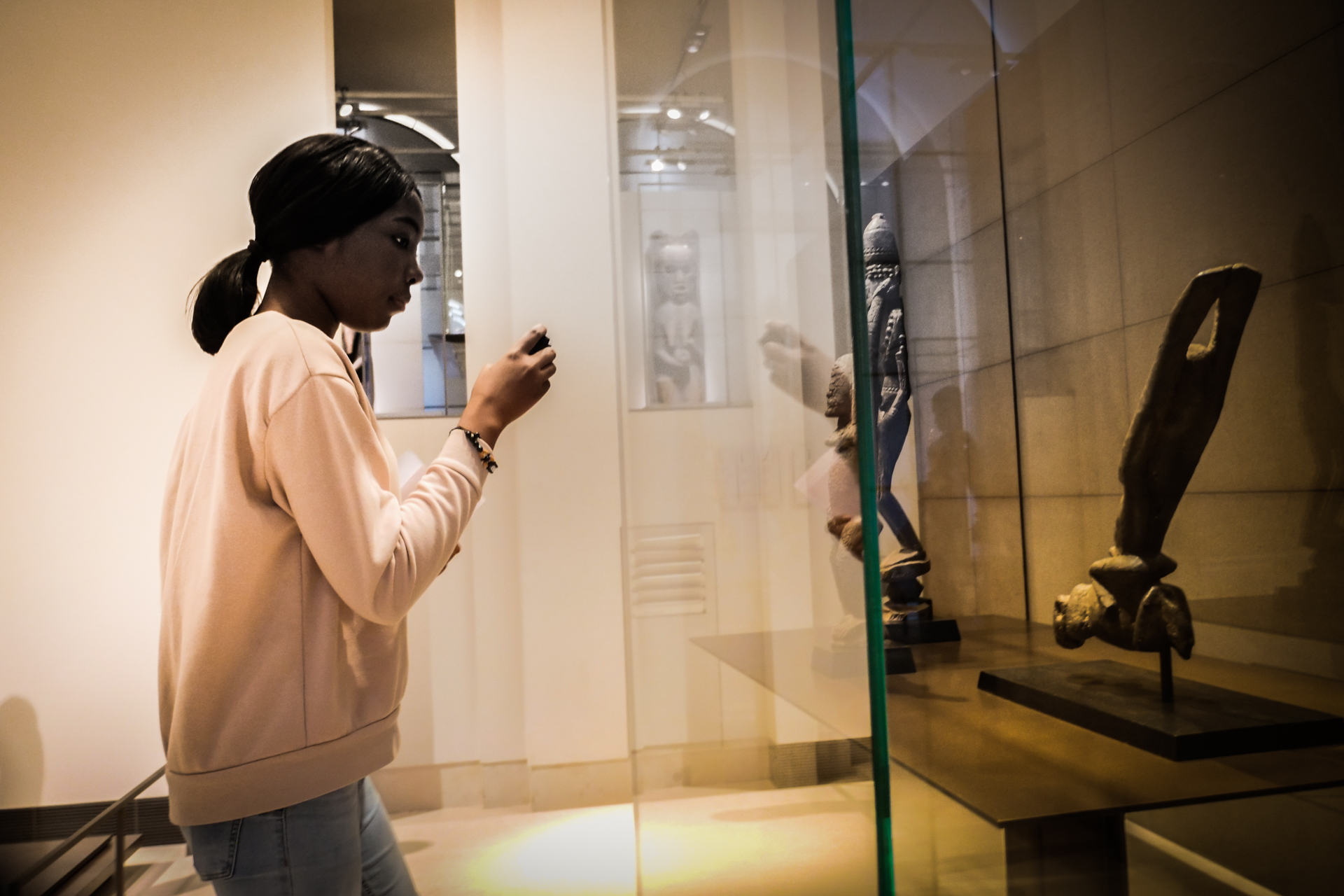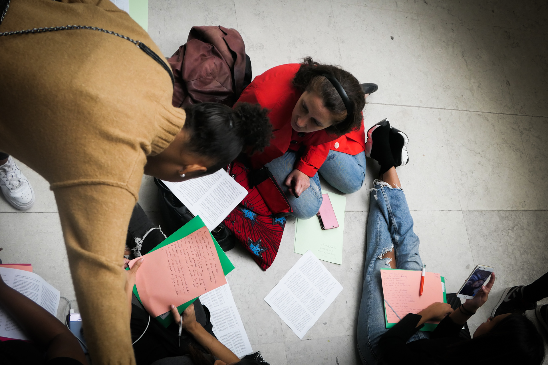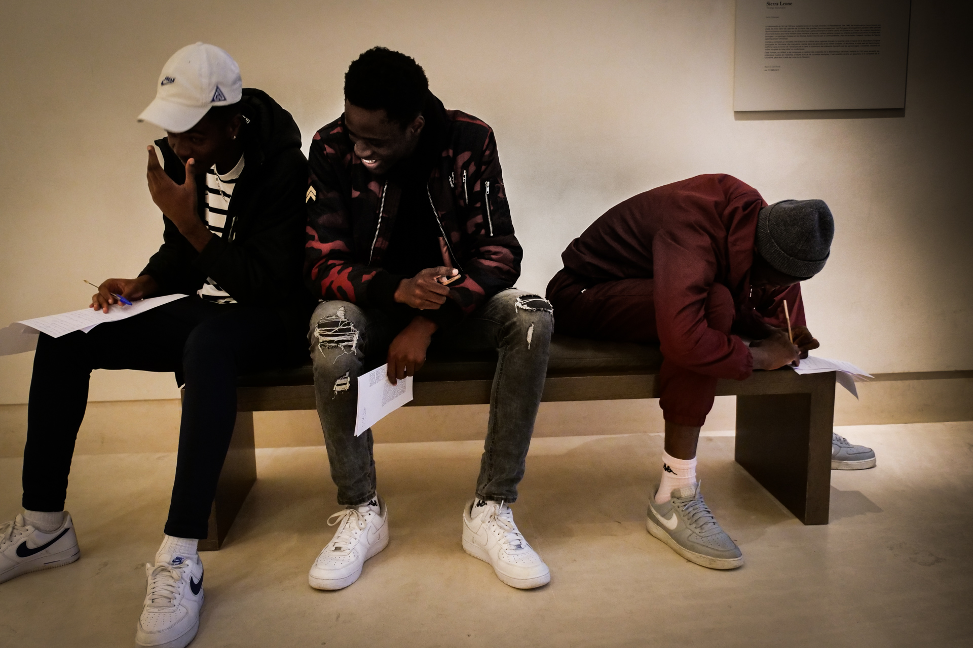 Hier matin, dans les salles d’arts africain et océanien du Louvre. J’ai apporté Exil de Saint-John Perse. On parlera aussi du caractère non artistique, mais rituel, religieux et divinatoire des oeuvres rassemblées ici, du statut des représentations féminines, du contexte de l’appropriation et des enjeux de la restitution. On parlera aussi de la fin de l’esclavage et de la route noire au fond de l’océan. Il faut traverser une grande diagonale du Louvre pour y accéder, je crois que cette marche, qui nous fond dans une image du monde tout entier, est aussi un moment important. C’est une classe qui a déjà une connaissance fréquente des salles, des oeuvres. N’empêche, quand on s’installe, une oeuvre va servir de déclencheur : ils se sont rassemblés devant la carte de l’Afrique, avec le nom des pays et leur taille. Un grand tour parmi les salles, mais comme rapidement, comme sans voir. Mais maintenant, avec comme chaque fois la grande bienveillance complice des personnels du Louvre (y compris lorsque nos élèves se seront approprié les cartouches multilingues comme écritoires, ce que nous n’avions pas anticipé !), les voilà eux-mêmes au sol, parmi les oeuvres, comme si elles et ils, corps, visage, et surtout la main qui écrit, étaient elles-mêmes ces oeuvres. Et l’écriture alors est puissante. L’écriture est belle. Quarante minutes passent comme une seule, nous gardons la dernière demi-heure pour la lecture : c’est moi qui lirai, sans dire les prénoms, l’écoute est hallucinante. En cours de route, ils ont deux GoPro pour filmer soit les oeuvres, soit eux-mêmes — mais clairement, pour l’instant, on a cette immersion écrite à traverser, aller au bout de ce qui naît.