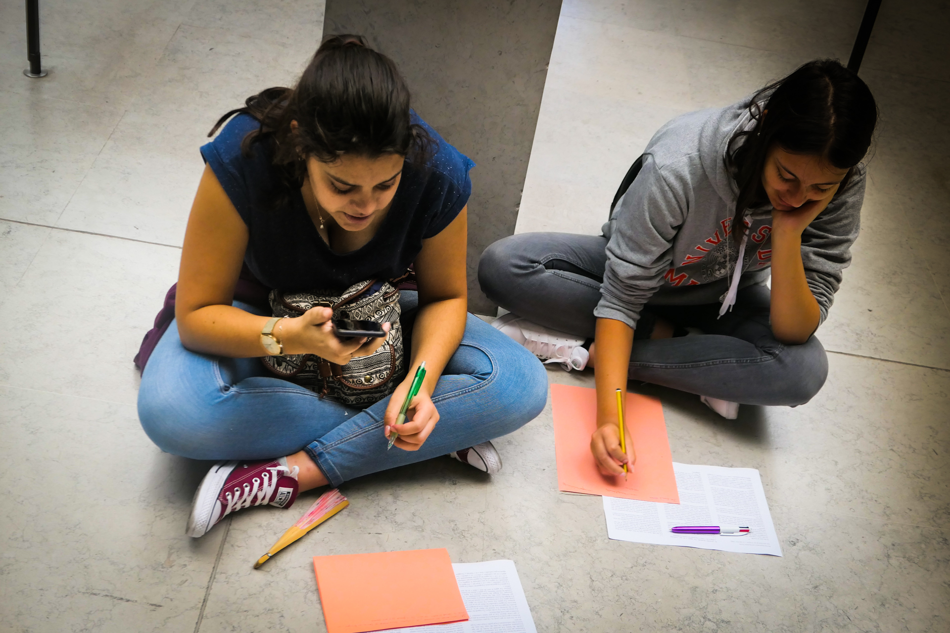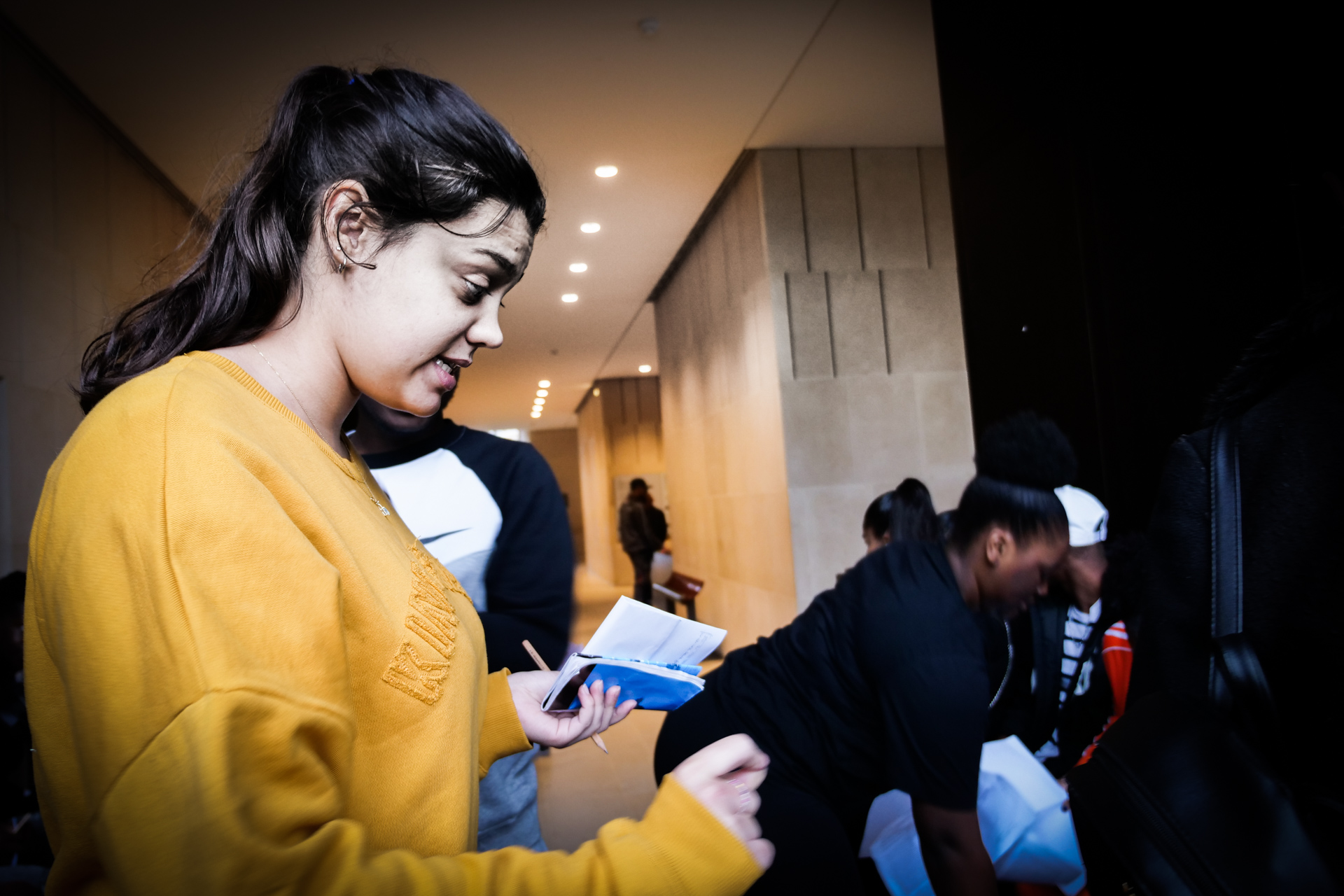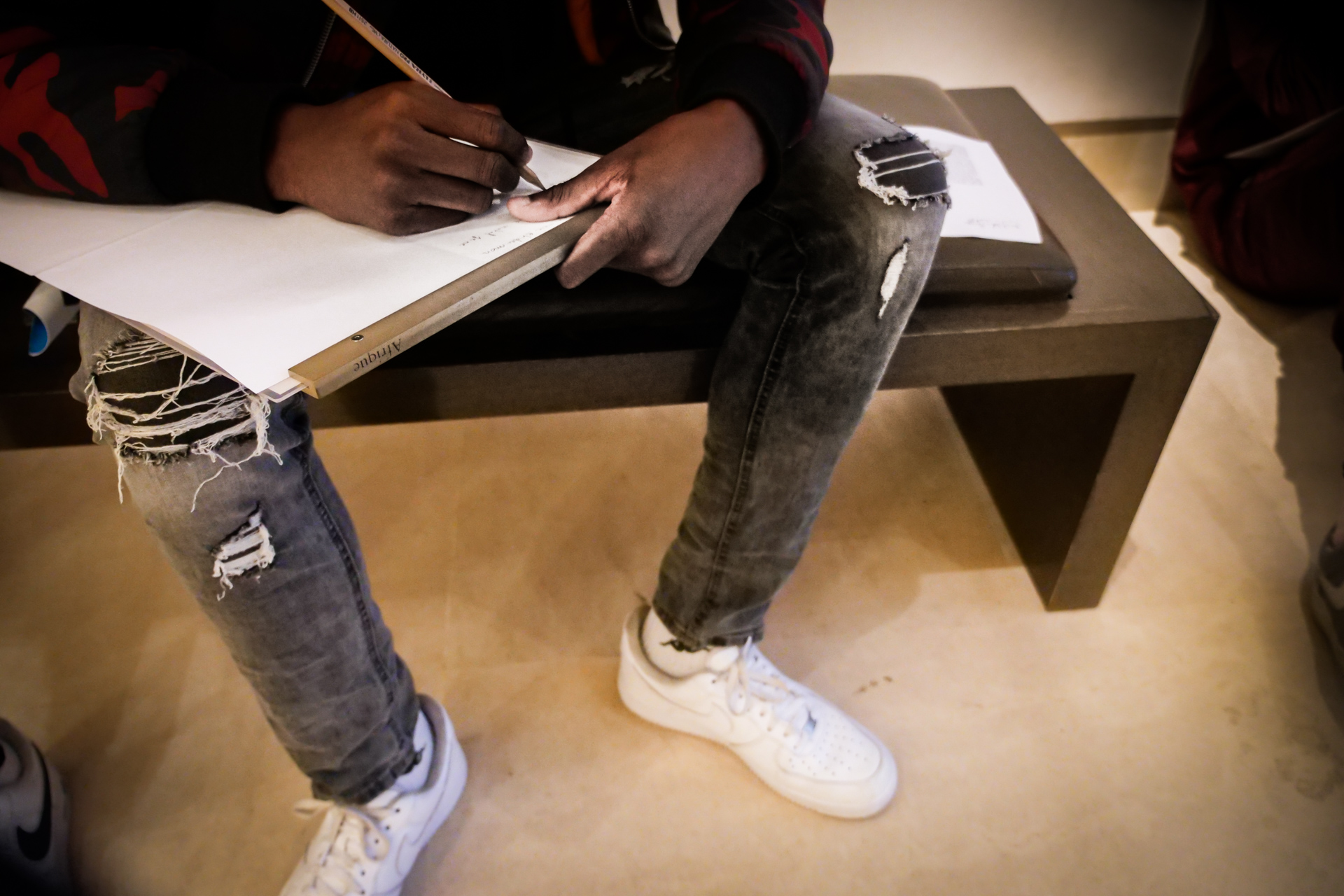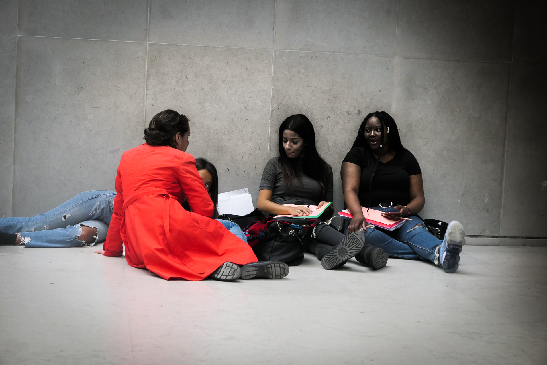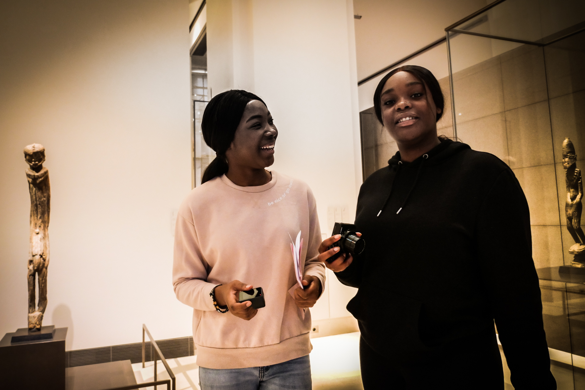 Hier matin, dans les salles d’arts africain et océanien du Louvre. J’ai apporté Exil de Saint-John Perse. On parlera aussi du caractère non artistique, mais rituel, religieux et divinatoire des oeuvres rassemblées ici, du statut des représentations féminines, du contexte de l’appropriation et des enjeux de la restitution. On parlera aussi de la fin de l’esclavage et de la route noire au fond de l’océan. Il faut traverser une grande diagonale du Louvre pour y accéder, je crois que cette marche, qui nous fond dans une image du monde tout entier, est aussi un moment important. C’est une classe qui a déjà une connaissance fréquente des salles, des oeuvres. N’empêche, quand on s’installe, une oeuvre va servir de déclencheur : ils se sont rassemblés devant la carte de l’Afrique, avec le nom des pays et leur taille. Un grand tour parmi les salles, mais comme rapidement, comme sans voir. Mais maintenant, avec comme chaque fois la grande bienveillance complice des personnels du Louvre (y compris lorsque nos élèves se seront approprié les cartouches multilingues comme écritoires, ce que nous n’avions pas anticipé !), les voilà eux-mêmes au sol, parmi les oeuvres, comme si elles et ils, corps, visage, et surtout la main qui écrit, étaient elles-mêmes ces oeuvres. Et l’écriture alors est puissante. L’écriture est belle. Quarante minutes passent comme une seule, nous gardons la dernière demi-heure pour la lecture : c’est moi qui lirai, sans dire les prénoms, l’écoute est hallucinante. En cours de route, ils ont deux GoPro pour filmer soit les oeuvres, soit eux-mêmes — mais clairement, pour l’instant, on a cette immersion écrite à traverser, aller au bout de ce qui naît.
