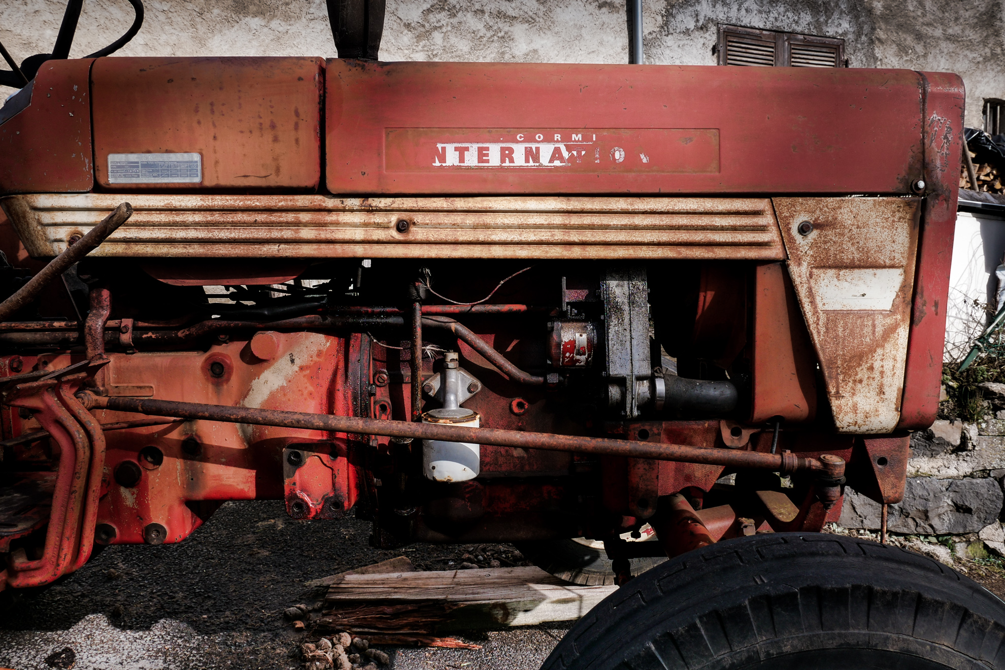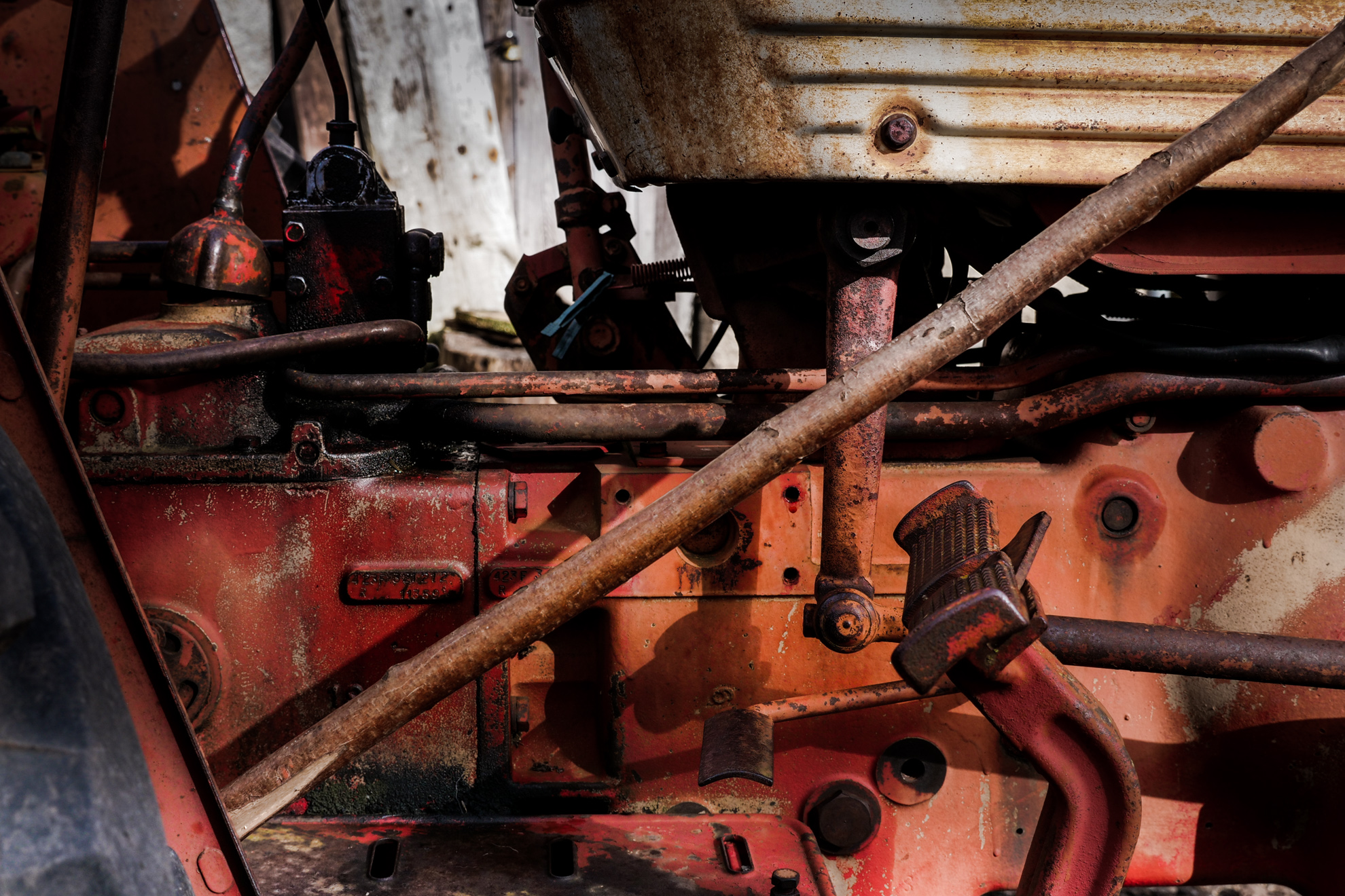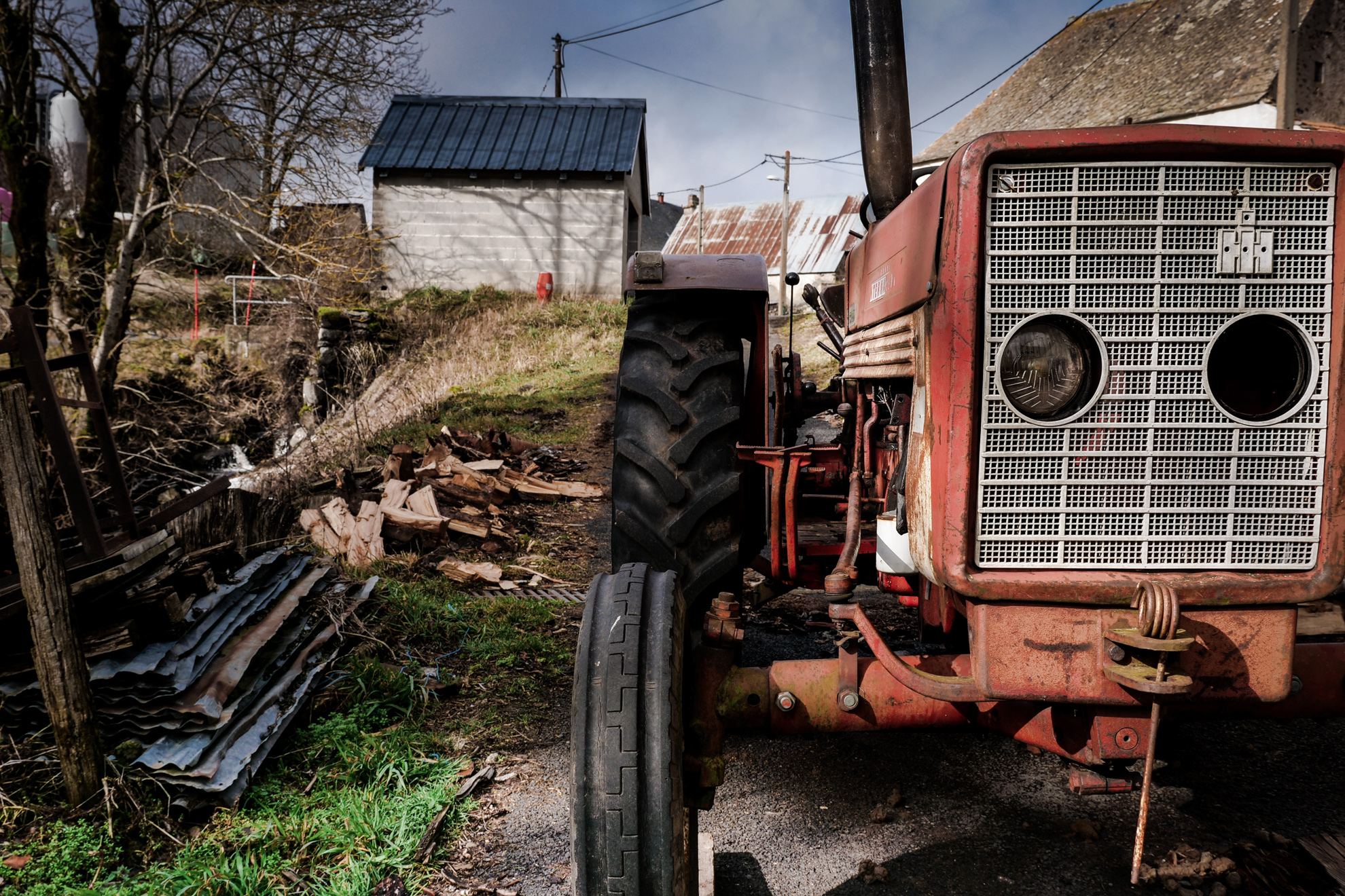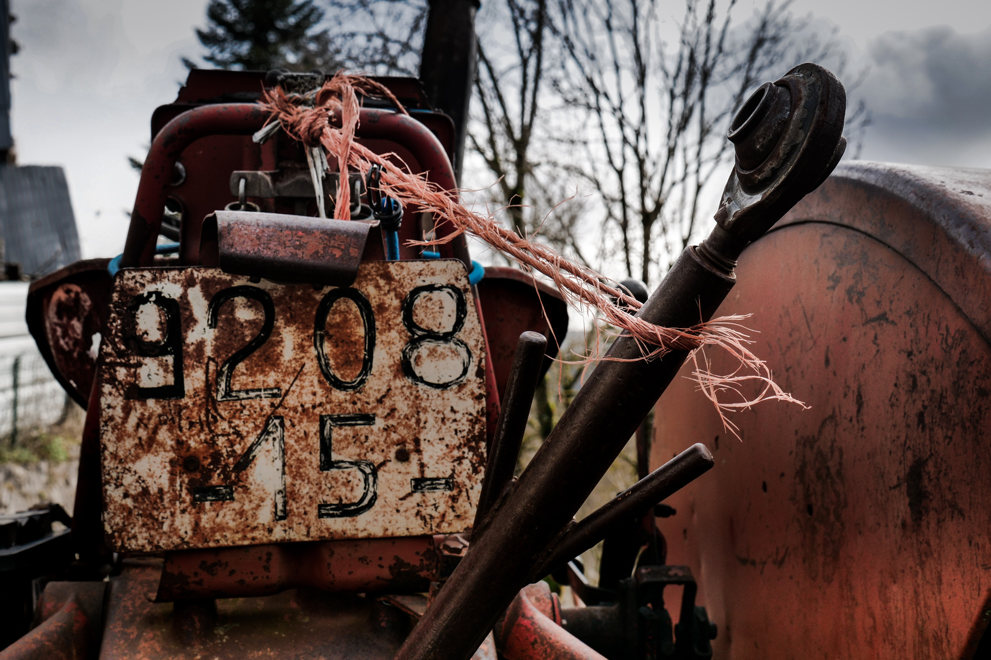 Je suis très fier d’être le site littéraire où la présence des tracteurs (d’autres machines aussi) est si régulière, et géo-localisable. Je ne crois pas que je sois jamais venu en Auvergne sans tirer le portrait d’un en particulier. Celui-ci parce qu’il barrait fièrement la route, mais pas pour une heure, pour des jours. Qu’il était bravement borgne. Et pour l’humiliation de cette boîte de conserve anti-pluie chaussant son royal pot d’échappement. J’aime la trace et l’empreinte, dans ces matériaux durs, d’un usage dur aussi. Lui, ses roues avant calées pour l’horizontale, voué à fendre le tas de bois infini et laissé en plan, sa prise de force offerte en anus vulnérable. Que ce site Internet assume une pérennité que ni le réel ni le livre imprimé ne peuvent plus assurer, c’est une mission à laquelle je pourrais même consacrer, voire exclusivement, les années de vie numérique qui me seront concédées. Je ne photographie pas, ici je peins, et pas seulement les choses mais le geste très humain qui conçoit, qui fabrique et qui use.