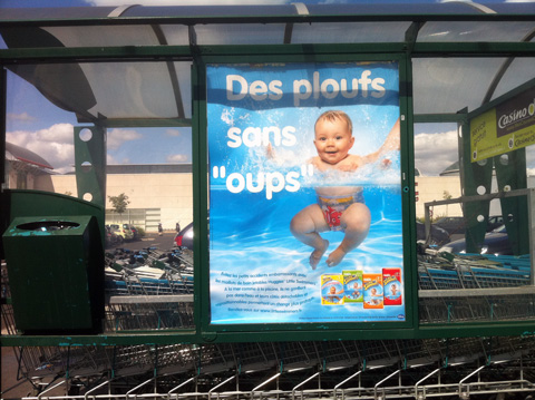 Il s’agit de maillots de bain jetables. J’ai l’impression que les pubs vendues pour être installées sur les garages à caddies, au supermarché, se sont adaptées au tarif bas de gamme – elles sont toujours surprenantes, pas comme les autres. On ne les imaginerait pas se propager ailleurs qu’ici, sur le parking où on rapporte le chariot pour reprendre pensivement le jeton en les contemplant. Il me semble que le fond en Photoshop bleuté marin a pu déjà servir pour une machine à laver qui lave (…)
