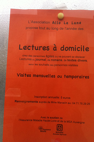 2 mars 2011, par François BonTouché tout à l’heure par cette affiche de l’association Allo la lune, avec soutien Assurance maladie et Mutualité sociale agricole. On vient donc à domicile, et selon vos souhaits on vous lit le journal ou un roman. Resituer dans ces montagnes âpres, où la désertification et le viellissement sont une loi générale. Il y a déjà eu des romans et films sur ce thème : mais à Ardes-sur-Couze, quelle fiction cela donnerait ?