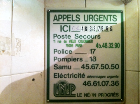 Ça ne se fait pas normalement d’aller photographier dans les toilettes des sous-sols des bistrots, mais c’était cette pub Le Néon progrès avec le numéro d’appel pour l’Eléctricité à l’accent baladeur. Est-ce donc qu’on descendrait ici dans le sous-sol (ancienne cabine téléphonique démontée il y a longtemps) pour apprendre le numéro des secours d’urgence, pompiers et SAMU, et selon l’ancienne répartition des chiffres sur les cadrans ? Pas très grave. Et les néons on en use encore, même là (…)