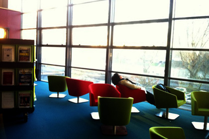 24 janvier 2011, par François BonElle m’a fait du bien, jeudi dernier, cette fille qui sommeillait dans le soleil d’hiver derrière les vitres à la BU d’Angers. Vue de loin, à travers une autre vitre, et rien vu d’autre même pas à quoi elle ressemble. Venir à la bibliothèque pour y dormir ? Des tas de souvenirs remontent, qui sont liés à dormir avec un livre, ou dormir parmi les livres. Avoir dans les lieux où on dort un livre, et donc, dans ces lieux où on vient par les livres, prolonger cet état mental de découverte, (…)