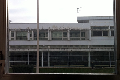 A un certain moment, derrière les fenêtres toujours vides du bâtiment d’en face, sont apparues deux silhouettes. Elles sont restées longtemps, immobiles, derrière la vitre. Puis, un peu plus tard, elles avaient disparu. Cela m’a fortement perturbé, tout le reste de la journée : je n’avais jamais vu personne, dans ce bâtiment. Et puis, pourquoi, tout ce temps derrière la vitre, c’est nous qu’elles semblaient regarder, et pourquoi ? D’autant que cette fac s’effrite littéralement, peinture, (…)