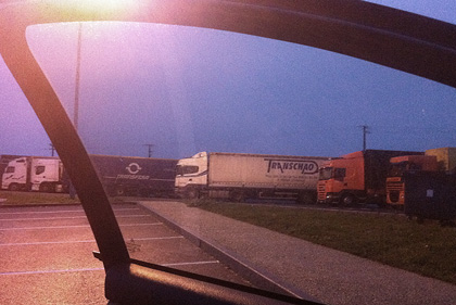 13 novembre 2010, par François BonÀ la station-service de Jaunay-Clan sur l’A10 sens descendant où je fais systématiquement une dizaine de photos chaque fois que je me rends à Poitiers, ce vendredi l’inscription trans chaos ou à peu près (en espagnol : transchao) sur un des camions au repos – chacun abritant dormeur. Que traversons-nous d’autres, nous tous, que le chaos commun ? Saison où il est nettement plus perceptible.