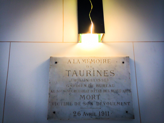 20 mai 2014, par François BonEn descendant à midi de la petite salle tout au bout du couloir à gauche (avec 2 angles droits et 2 escaliers) du Ministère au 3 rue de Valois, je photographie cette plaque, qui doit dater d’il y a bien longtemps, et a dû survivre à un nombre considérable de réfection des lieux, quoique à mesure qu’on s’éloigne de l’étage d’honneur les réfections ont dû être plus humbles aussi. C’est ce MORT en très gros qui m’a retenu, et la date : 1911. À LA MÉMOIRE DE TAURINES (ROLLIN ULYSSE) / GARDIEN (…)