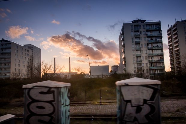 3 mars 2014, par François BonCe n’est pas si facile de prendre des photos de train. Le matin même, j’avais tenté de refaire cette photo autrefois demandée à Philippe De Jonckheere et le cimetière avec ses allées alignées sur la géométrie des immeubles était venu tout seul se placer devant moi. Je prends rarement cette ligne Paris-Clermont. Un autre endroit surprenant, c’est à Ivry, les deux bâtiments perpendiculaires à la voie, un autre au fond à l’arrière, et au-dessus, dans une géométrie parfaite, les deux cheminées (…)