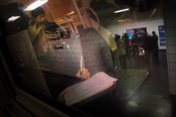 C’était ce matin dans le RER, une fois que délesté brutalement de tous ceux qui s’engouffrent dans les tours de la Défense, et que ne restent plus que celles et ceux qui vont tout au bout vers Achères, Conflans, Sartrouville et Cergy. Moi je faisais des photos, dont celle-ci dans le reflet. La jeune enseignante, elle, avec son 4 couleurs, corrigeait et annotait les « compositions de textes » à l’encre bleue, 4 pages grands formats, de toute une classe. Je viens 2 jours par semaine, elle sans (…)
