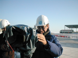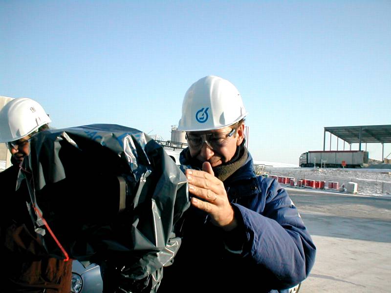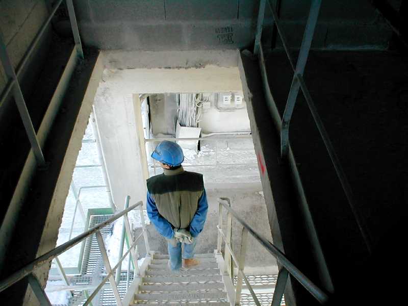 on a déjà parlé de Paysage Fer texte, publié il y a deux chez Verdier, avec 15021, chez L'Amourier, en compagnie de Jérôme Schlomoff (photos ci-dessus) – pendant quelques secondes, dans la vitre du train, un paysage gigantesque et blanc vous enserre et vous surplombe, avant que le tunnel de Sorcy fasse brutalement tout disparaître – décider d'y venir, c'était déjà fanchir la frontière du rêve au réel: pourtant, une fois garée la voiture, c'est tout un paysage humain dont on va très amicalement nous faire pénétrer la complexité – il y a avec moi Fabrice Cazeneuve, réalisateur, et Pierre Bourgeois, opérateur : il faisait 15 degrés en-dessous de zéro ce matin-là sur les bords de la Meuse, où les inondations sont devenues une mer gelée c'est une cathérale, un palais de l'art industriel – le groupe LHOIST a d'ailleurs constitué ces dernières années un fonds d'art contemporain où des photographes de la taille des Bernd et Hilla Becher se confrontent à ces emprises à la Piranèse, dressant vers le ciel ce qu'on extrait à la terre – une craie de la meilleure blancheur, ancestralement exploitée, et sur le site près de 4 kilomètres de bandes porteuses - savez-vous qu'un livre d'aujourd'hui, pour que le papier soit assez lisse lors de la fabrication, mêle à la pâte papier de la chaux recarbonatée, dont la granulosité alors n'est de que 78 microns? à gauche, l'ensemble de quatre fours droits construits avant-guerre, à l'époque des rêves futuristes en béton – à droite le four rotatif on nous a équipés de casque et lunettes, et Pierre Bourgeois, pour éviter les projections de chaux, a encapuchonné notre fragile DV Cam - on nous emmène sur les passerelles hautes, le rêve inaccessible du train, tout au long de l'immense four rotatif à 1200 degrés, toujours en vue du train installé il y a une trentaine d'années sur l'ensemble du site, on dirait que l'architecture des superspositions arbitraires du temps (le site a bientôt 100 ans) se joue de l'immensité du ciel pour inventer des figures d'une beauté que le blanc uniforme des sols et des matières rend pafaitement abstraites, et pourtant toujours en liaison étroite avec ce sous-sol de craie magiquement blanche qu'on extrait et concasse - à gauche, le double four vertical Maerz, et à droite la cheminée anti-pollution (un des débouchés aussi de la chaux dans l'ère moderne, que la dépollution des résidus industriels ou le traitement des eaux usés - et le four rotatif brûle pour l'essentiel des matières de récupération broyées) - il manquera à cette page webcam, faite avec un tout petit appareil numérique, l'émotion des visages : hommes qui, dans leur tenue ou leur geste du travail, acceptaient que nous en fassions trace (ici, visite du four Maerz avec Sébastien Grigis, ingénieur Process et spécialiste de la complexe transformation chimique de la craie selon son utilisation, affinage d'acier ou stabilisation du remblai du futur TGV, qui fera qu'aucun voyageur ne verra plus se dresser dans le ciel les échafaudages fantastiques de Sorcy...)