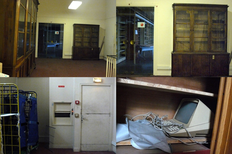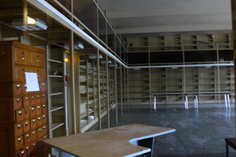 Dans ce bâtiment, il y en avait des dizaines, ainsi, de salles vides. J’y avais fait des dizaines, peut-être des centaines de photos : chaque année, depuis bientôt cinq ans, j’avais eu l’opportunité d’y passer une soirée. Les étudiants écrivaient, pendant ce temps je visitais chaque couloir, chaque bureau déserté, chaque dossier resté sur une étagère : rien d’indiscret, d’ailleurs, l’administration ne s’intéresse qu’à elle-même, et ne produit que ce qui la concerne, elle seule. J’avais ainsi été témoin indirect de cette évacuation progressive. Les années précédentes, je n’avais pas eu accès à cette pièce. Réservée aux livres, à l’étude, elle était fermé à clé quand nous entrions.