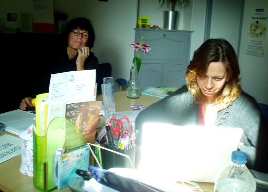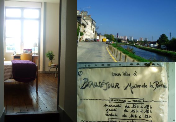 Autre visite qui n’est pas de politesse : la Maison de la Poésie. La Golf de François Rannou, où je redécouvre les "rehausseurs" frères de ceux récemment évincés (ouf) de mon propre véhicule nous fait longer ce canal échappé au temps, même si les immeubles pointent leur tête. Je repense à Rimbaud : "La ville avec sa fumée et ses bruits de métiers, nous suivait très loin dans les chemins. O l’autre monde, l’habitation bénie par le ciel, et les ombrages !" Bénie je ne sais pas, mais les ombrages et le ciel y sont, et le silence qui tient très loin le bruit de la ville. Au premier étage, l’appartement habité (je dis bien "habiter" et non "résidence") par la québecoise Denise Desautel, et au rez-de-chaussée, on est samedi après-midi pourtant, Cécile Ménard et son Mac tout blanc. Alors pourquoi pas encore un vrai site, les amis ?