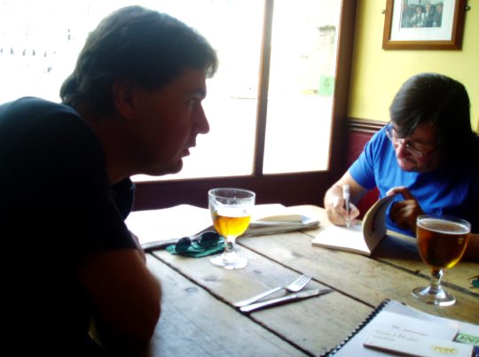 Et puis je ne suis pas doué pour attraper les visages, sauf dans ces moments calmes, ici François Rannou (à gauche) et Jacques Josse (à droite), les organisateurs, avec qui on préparait pour lors la lecture rencontre qui s’ensuivrait l’après-midi au TNB.