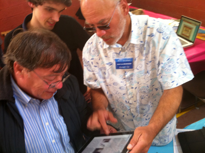 Image : Ouessant, 21 août, Jean-Lou Bourgeon et Clément Monjou (eBouquin) font à Jean-Claude Bourdais, un historique du site littéraire, une démo de son propre site sur iPad.