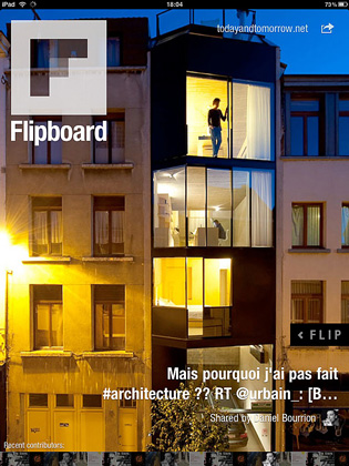 Paradoxe de lire sous forme de contenu éditorialisé et dans une typologie d’affichage séparée du flux, dans un rapport de lecture dense, non pas seulement les informations absconses qu’on propulse, mais les contenus eux-mêmes, recréation instantanée d’un magazine incluant alors et vos propres articles (si vous les répercutez, puisque vous ne verrez jamais un des ténors de la création et réflexion web, Karl Dubost, sur twitter karlpro indiquer lui-même ses nouveaux billets...), ou ceux de vos amis (ainsi, les magnifiques échappées de Karl, puisque je les retransmets, se retrouveront dans mon propre accès FlipBoard).