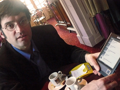 Ah, si je cherche dans mes archives, je vais bien trouver une photo ou plusieurs de Stéphane Michalon : on a commencé ensemble, lui dans la fondation d’ePagine et moi publie.net, je me souviens de nos premiers rendez-vous, et les essais de textes sur le premier CyBook...