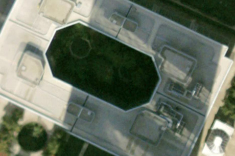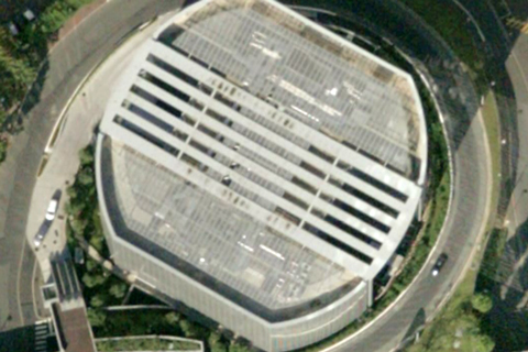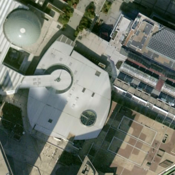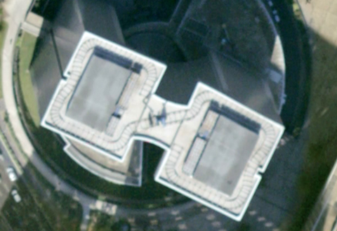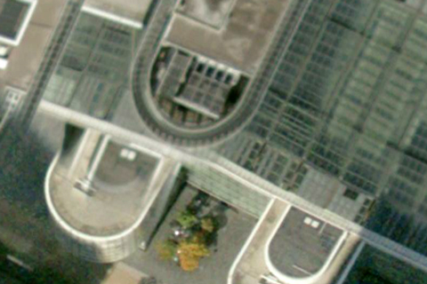 L’avantage du web, c’est le travail qui commence dès en amont, les échanges, courriers... Là, de Raymond Bozier, question toute directe : « si par chance tu parvenais à pénétrer dans la tour Total ou Aréva, pourrais-tu aller jusqu’au sommet voir à quoi ressemble leurs toits (qu’y ont -ils mis : plantes, piscine, graviers, bancs ?) je serai curieux de savoir » – c’est ce travail de curiosité qui est peut-être une chance, à s’offrir le temps de l’attente, du sur place, et des interlocuteurs aussi à qui je pourrai poser la question. En attendant, les toits j’y vais par Google Earth. C’est vite fascinant : le cimetière qui jouxte la grande Arche, sur l’autoroute, à la sortie du tunnel, on le surplombe brièvement comme à passer à travers les tombes. À Québec, l’an passé, j’avais croisé des urbanistes qui travaillaient à occuper les toits et les parkings de la ville. Ici, difficile de savoir : mais quelles belles géométries. Sauf que la tour Areva (ci-dessous, la dernière), est légèrement floue : floutage stratégique, via demande expresse à Google ? Mais ce bucolique chemin de fer, pour supporter la nacelle de nettoyage, tournant en huit à des dizaines de mètres au-dessus du sol ciment. Peut-être, dans la valise, devrais-je aussi emporter des jumelles. Alors, Areva, vous me ferez visiter ?