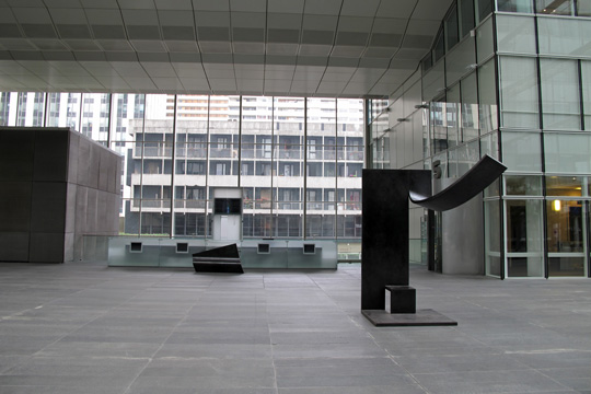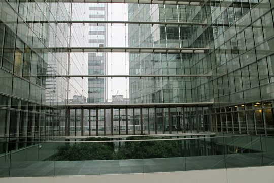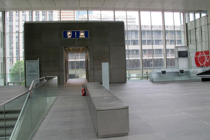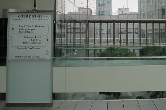 Sur le parvis de la Défense, chaque tour a un nom. Parfois juste le nom d’une marque, Areva, Total, EDF, SFR. D’autres fois un nom plus générique. Mais pas l’apparat des downtowns de l’autre continent, avec cerbère galonné pour piloter l’entrée depuis ses rambardes de cuivre. Je suis donc entré dans COEUR DÉFENSE parce que c’était écrit COEUR DÉFENSE, qu’une verrière joignait les bâtiments en un vaste espace intérieur, comme suspendu, où toute la ville soudain n’était plus qu’une vague rumeur très loin. Et puis pour ce double escalier s’enfonçant à même le sol : de n’importe où dans la Défense on sent la présence des souterrains, mais c’était triste et sans lumière, avec la vague indication d’un centre de congrès sans congrès. C’est cette sensation de vide (personne, juste deux personnes sur un banc de ciment, attente improbable) qui m’attirait : le coeur de la Défense est un coeur vide. Et puis ce mastaba, pesant volume cubique dans le cube de verre. J’ai pris cette photo, et puis une autre des verrières. Alors le monsieur à casquette s’est précipité sur moi de très loin : Il y a des têtes de femmes ? me demanda-t-il trois fois... Et je cherchait où pouvaient être ces têtes de femmes. Il me montrait mon appareil-photo, pourtant un petit compact de rien du tout : – C’est interdit, les photos, il faut les effacer, montrez si vous avez des têtes de femmes... Je n’avais que ces photos ci-dessous, il a bien voulu condescendre à ce que je ne les efface pas. Le coeur de la Défense serait plutôt fait de fantômes, de femmes sans tête alors ?