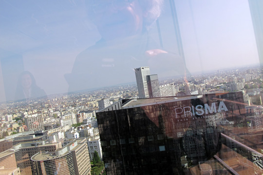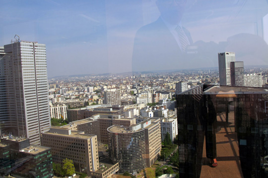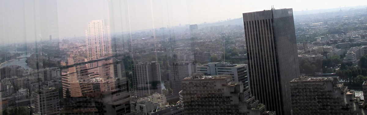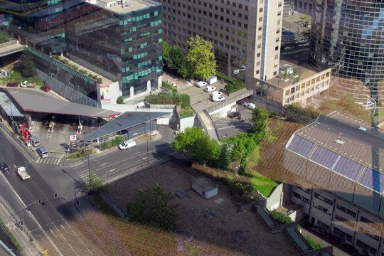 Dans le livre de Jean-Luc Nancy récemment paru, La ville au loin, il y a un fort passage sur les vues cavalières : la construction artificielle, avec les outils du dessin et du peintre, pour glorifier la ville vainqueur, la ville officielle, d’un système de représentation où tout était visible d’un point qui n’est pas celui de l’observateur habituel – et l’artifice de la représentation cavalière, c’est que même si on plaçait à cet endroit un observateur, il ne verrait jamais tout à la fois comme c’est le cas sur la toile. La vue cavalière, notre Jean-Luc Nancy, date d’une période (se hisser sur le cheval pour voir loin, c’est le propre du chef jusqu’à l’âge napoléonien, plus après) où voir d’en haut n’était pas possible. Nous y arrivons via Google Earth : il y a quoi, sur les toits, à la Défense ? Nous y arrivons en escaladant les toits : les touristes montent sur l’Arc-de-Triomphe, mais le toit de la Grande Arche n’est plus accessible (billet à venir). Alors ce matin j’ai tenté, à la place, de voler. Je n’avais pas le droit d’aller plus haut que les tours. Je me tenais à ce qui doit correspondre entre le vingtième et le trentième étage. Le matin était froid et sec, la visibilité parfaite. J’en ai beaucoup profité. On a, quand on vole, seul, sous son petit engin silencieux, une sensation de liberté grande, de solitude belle. On m’avait demandé de ne pas approcher de ces modernes forteresses, bien gardées, que sont les tours Areva, Total, EDF, SFR – moyennant quoi j’ai pu explorer, vu du ciel, une large partie de la Défense. Il est dur, ensuite, le reprendre les chemins du ciment – la ville apparaît en miniature, en jouet infini. J’ai volé, je vous en rapporte ces images.