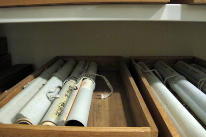 Photo : rouleaux japonais du XVIIe siècle, bibliothèque universitaire de Louvain-la-Neuve (voir mes pages résidence).