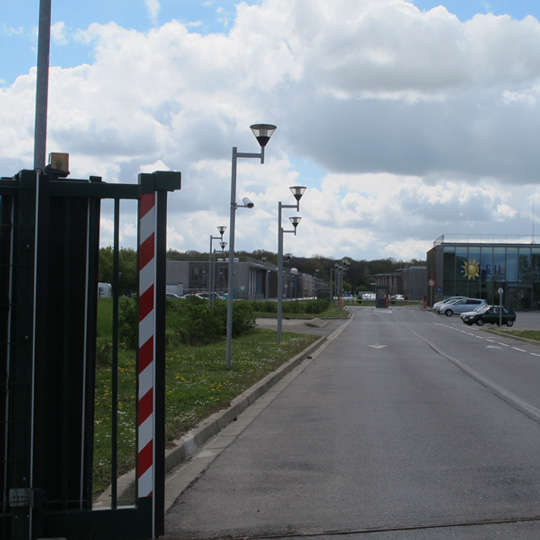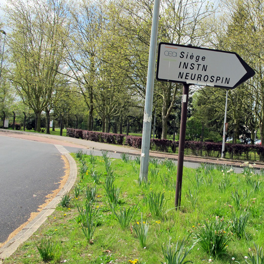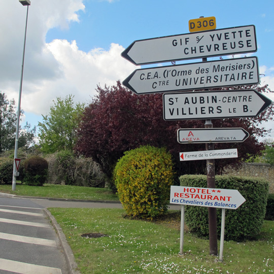Il s’agit donc d’une route à deux voies étroite, uniforme et rectiligne, longeant à sa droite les grillages fermés du CEA, avec derrière une haie végétale discrète qui occulte les bâtiments, suivie d’un golf et de la publicité pour ce golf (à quoi sert un golf ?), signalant que le Français ordinaire peut venir déjeuner à sa cafétéria d’une formule à 12 euros mais je doute qu’ils fassent beaucoup concurrence au Relais. Puis rond-point avec arrêt de bus pour desservir le hameau de Saint-Aubin (au rond-point du Christ, Saclay était une bourgade pas très différente, reste sous-jacente dans la carte au présent la première disposition rurale, mais comme s’il fallait soulever le transparent avec le monde actuel pour les retrouver intactes).
