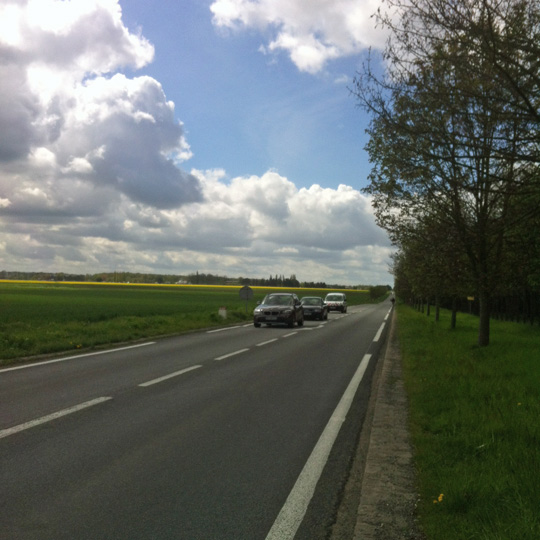 Un moment, une petite voiture (Peugeot) qui roulait bien trop vite a freiné en arrivant derrière celle qui la précédait, à quelques dizaines de mètres devant moi, puis a déboîté sur sa gauche pour la doubler en accélérant à fond, puisqu’une autre voiture arrivait en face. De mon point d’observation, j’ai cru le choc frontal inévitable. La voiture en face a fait des appels de phare, puis un long coup de klaxon, mais qu’avait à en faire le chauffard ? Quel con, j’ai pensé.