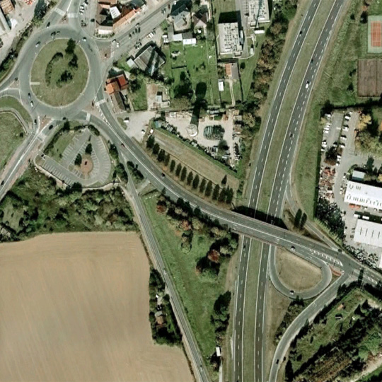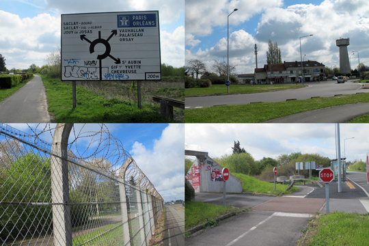 On devine, comme pour les anciennes voies romaines, l’émergence de l’ancien tissu des routes, celles qui allaient de bourgade à bourgade : au Christ de Saclay, créant des zones urbaines greffées désormais sur le réseau principal qui les frôle – vous sortez de l’autoroute, vous quittez la bretelle par l’ancienne route, vous vous approvisionnez de ce qu’il vous faut, et vous repartez sur l’autoroute, il faut moins d’une minute trente – et le sol est la lecture de l’usage urbain qui s’est rétabli sur la route désertée.