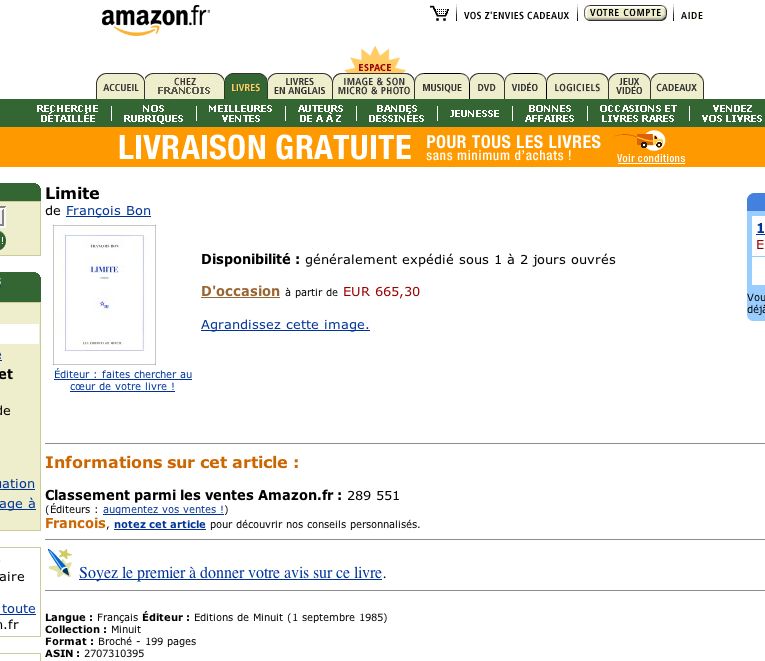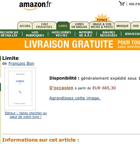 Reste à expliquer le jeu d’amazon.fr ? Et l’ironie du "généralement expédié en 24h" : ils en ont donc vendu tellement, de Limite à 665 euros d’occasion ? Plus la pub pour nous inciter, auteurs et éditeurs, à accepter la fonction "chercher au coeur" (Baudelaire : Ne cherchez plus mon coeur, les bêtes l’ont mangé), qui les autorise eux à numériser entièrement l’ouvrage sur leur serveur. C’est tellement beau, de s’en remettre au coeur.
