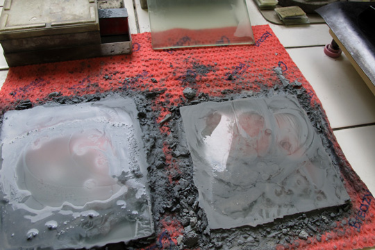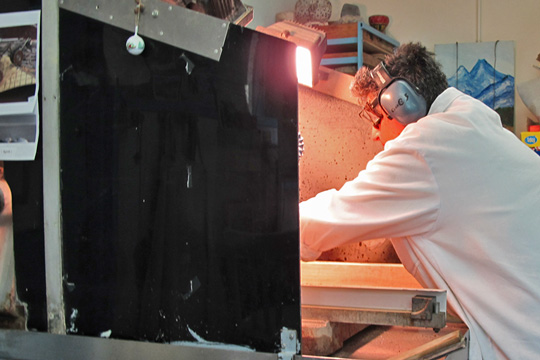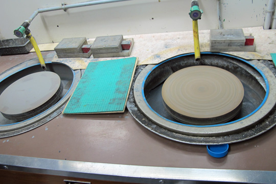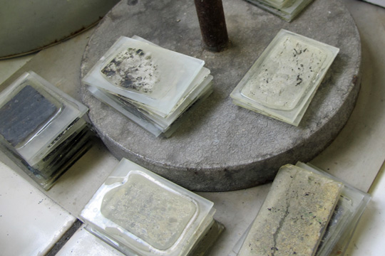 La matière première, on la voit sur les étagères, ou par terre dans ces cartons apportés par les chercheurs. Relire le Galet et Introduction au galet de Francis Ponge : matière terne et informe – pour le commun des mortels : des cailloux, immatriculés au stylo feutre. Mais voici le vrombissement de la scie – elle, la litho-lamelleuse, avec lunettes et casque anti-bruit, les mains nues presque à toucher l’énorme lame et ses grains de diamant artificiel. A côté, ce qu’elle nomme lapidaire ressemble à la double platine des disc-jockeys, si les disc-jockeys dans les boîtes de nuit se servaient de plateaux de bronze, avec du carbure de silicium pour éroder les marques de la scie sur la petite tranche de minéral.