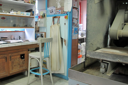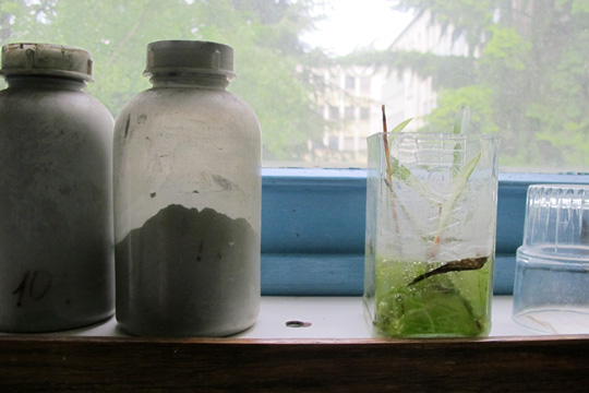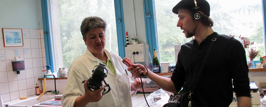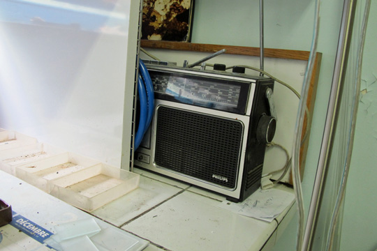 Cette pièce est plus qu’habitée. Pas encombrée cependant. Juste que chaque coin, recoin, du sol au plafond, accueille un signe personnel. L’échelle en change de la même façon que change la taille du minéral, de la scie au lapidaire, jusqu’à la lame de microscope. Elle a gardé des pierres parce qu’elles sont plus belles ou plus rares. Mais j’ai remarqué un tout minuscule bouquet des pervenches du chemin qui mène à l’arrêt de bus. Et une myriade d’objets qui mériteraient à la prochaine visite d’étudiants de licence on leur demande de les décrire, plutôt que s’intéresser aux lames. On est tout au bout du couloir et on sent que ce domaine lui appartient en propre. Dans la pièce voisine, réservée au polissage, cette photographie noir et blanc près de l’ordinateur est celle de ce M. Chauvet, qui l’a initiée à comment voir à travers les roches, et remettre à ces messieurs les géologues des épaisseurs de 30 microns qui sont en deçà du mesurable, s’il s’agit de roche. Il sont encore 70 litho-lamelleurs en France, environ, mais à écouter les chercheurs du couloir, ils n’échangeraient guère leur litho-lamelleuse pour un autre...