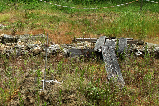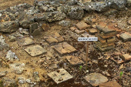 Ici ça tombe bien, il y a encore de la place. Les vestiges des étudiants qui ont procédé à la fouille, ce petit pont de planche, ou cette inscription hypocauste (fourneau souterrain, me dit Littré) sont plus émouvantes, dans ces verts intenses d’une fin de printemps pluvieux, que l’alignement humble des vieilles pierres.