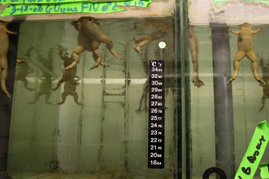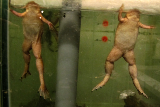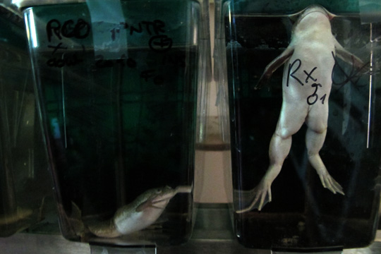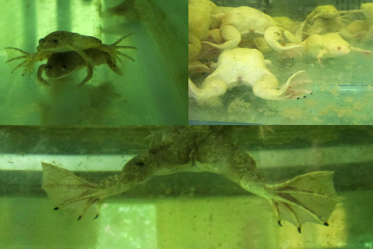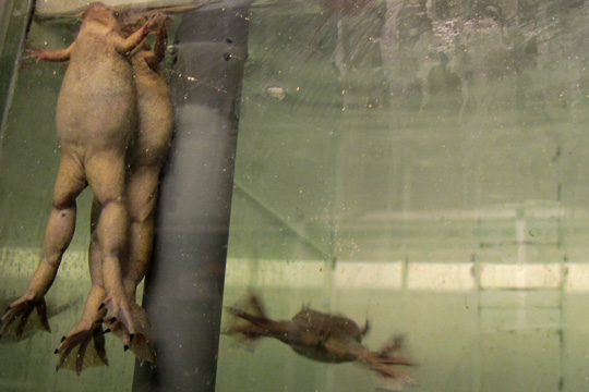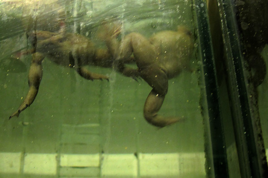 Et c’est à cela à quoi je pensais, au retour : celui qui, devant les xénopes, porte le savoir des biotopes du lac Victoria n’en a pas encore fait le voyage. Alors, en se disant que si on a beaucoup regardé les xenopes, peu de chances qu’eux aient été très troublés de notre visite, repenser autrement à Axolotl de Julio Cortazar – un des plus grands textes du fantastique contemporain dans le dialogue muet d’un homme et d’un batracien (lire le texte).