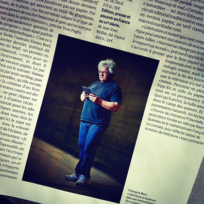 Et sont cités dans l’article Yves Pagès, Chloé Delaume, Paul Fournel, Eric Chevillard, Martin Winckler, Laure Adler, Emma Reel, Didier Daeninckx, Hervé Le Tellier – se fissure donc de plus en plus vite désormais l’idée que le numérique ne concernerait qu’une frange d’excités marginaux.