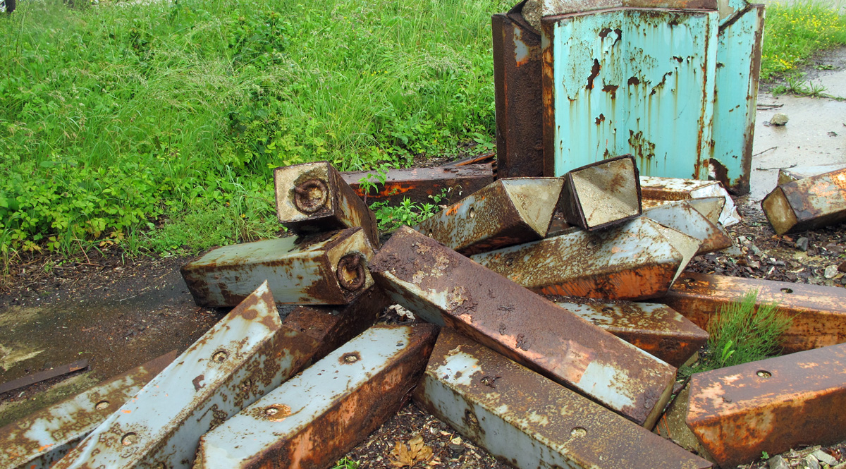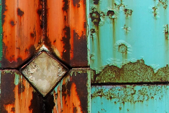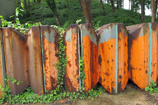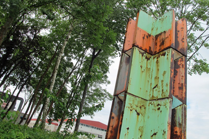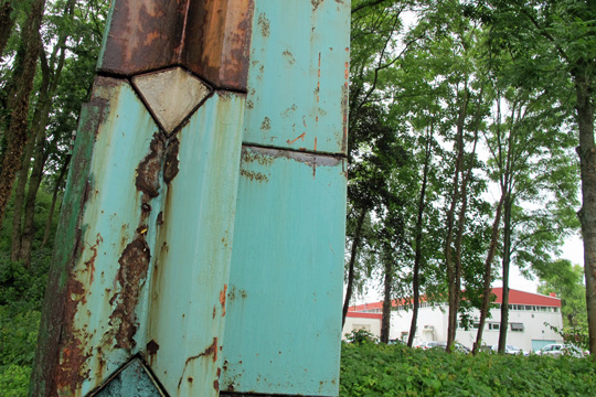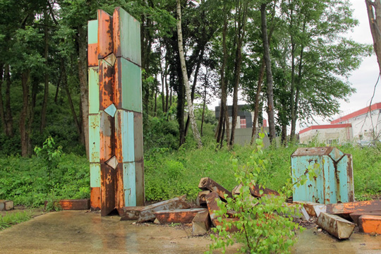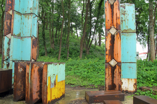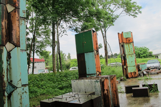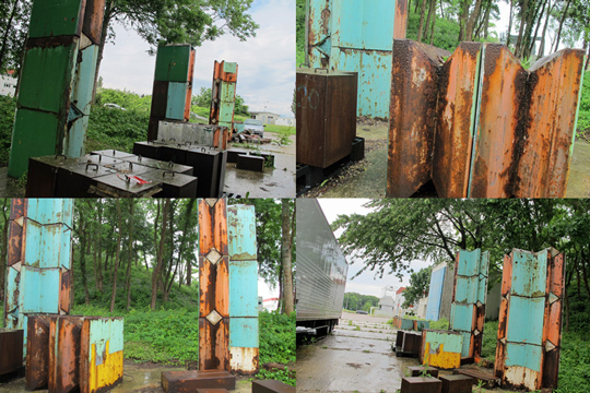 Deux semi-remorques closes garées tout auprès, et ces trois totems en couleur, avec paysage d’acier autour. La force d’un Richard Serra, et je ne dis pas ça souvent.