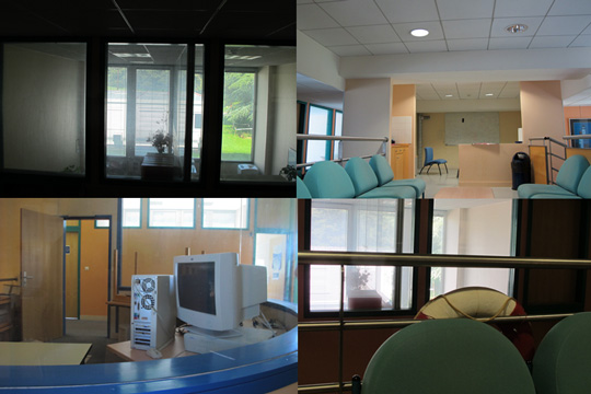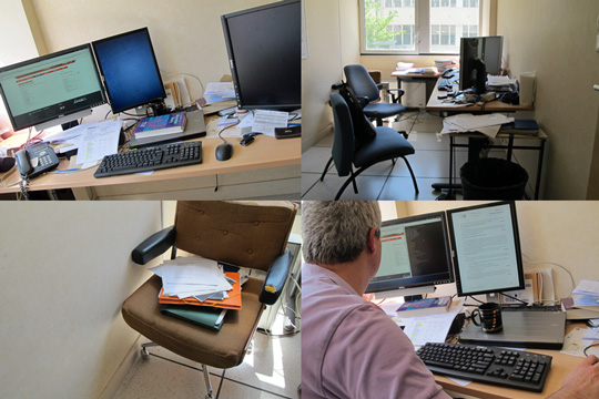 Pour le reste, je confirme : rien à voir. Je note des détails : Daniel Augot a un fauteuil relativement neuf, un siège qui permette de tenir dix heures à l’ordi ça compte. Mais quoi faire du vieux, quand il s’agit de mobilier national ? Il reste au bout du bureau et sert aussi à recueillir les piles de papier – trait caractéristique de bien des labos où nous passons. Et j’ai toujours un regard pour ces engins à roulettes, qui portent aux accoudoirs la marque de leur dix ans d’usage (l’accoudoir gauche souffre plus vite que le droit).