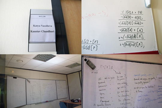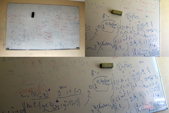 Je regarde aussi les tableaux : ces tableaux blancs effaçables, qu’on trouve dans chaque couloir et chaque bureau sur le plateau. Et jours, quand on en regarde un de près, la personne qui vous accueille vous dit que non, il ne faut pas faire attention, c’est juste une petite démonstration sur ceci ou cela, rien de caractéristique n’est-ce pas... Daniel Augot le prend plus au sérieux : je demande si, pour penser et travailler, il y a un rapport entre la taille du tableau, à l’échelle du corps, qui serait plus favorable que la taille de l’écran d’ordi, devant lequel on peut aussi s’installer à deux, mais qui ne prend pas en compte le geste même (la poésie c’est un mouvement du coude, disait René Char). Par exemple, deux tableaux, rien moins, dans cette petite mezzanine de la machine à café – le tableau est le lieu corporel, debout, où on travaille à deux (« pour penser à deux, se montrer des bouts de trucs »). Et même, parce qu’il est question que leurs bureaux soient déménagés dans un nouveau bâtiment, l’inquiétude que le nouveau mobilier – toujours les architectes – n’ait pas prévu les fameux tableaux : « on aura des armoires sur lesquelles on pourra écrire, ce n’est pas la même chose... »
