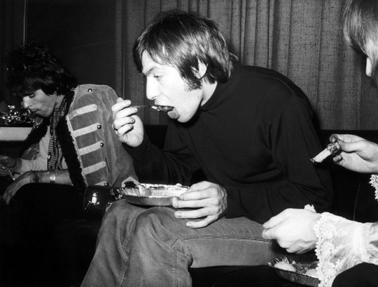 Voir ces deux entretiens, pour cette manière précise d’élocution, et sa tenue. Parmi toutes mes photographies de Charlie Watts, je crois que c’est celle-ci, dans les heures d’attente de la longue nuit du Rock’n roll circus, le 11 décembre 1968, que je préfère : un Rolling Stone qui mange.