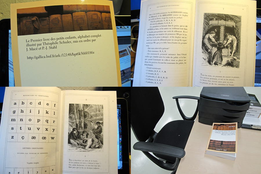 Pas à moi de révéler la technique intérieure. Quiconque a feuilleté (c’est une maladie personnelle, mais avouable) régulièrement le site Gallica sait la disparité des formats, les numérisations pas très verticales... Sur les cinq livres que j’ai eu en main dans l’atelier de Maurepas, l’homothétie permet aux PDF, si divers qu’ils soient, de correspondre au format de page identique de la collection, et c’est époustouflant – voir ce Premier livre des petits enfants, alphabet complet illustré de Jean Macé en 1878.