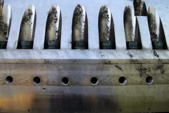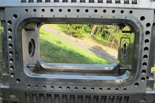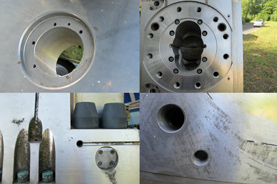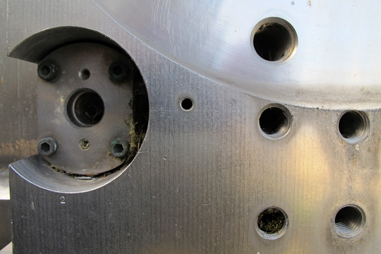 Pensé à tout cela, en longeant le parking, et photographiant les alésages de la chambre à bulles scellée à l’oblique.