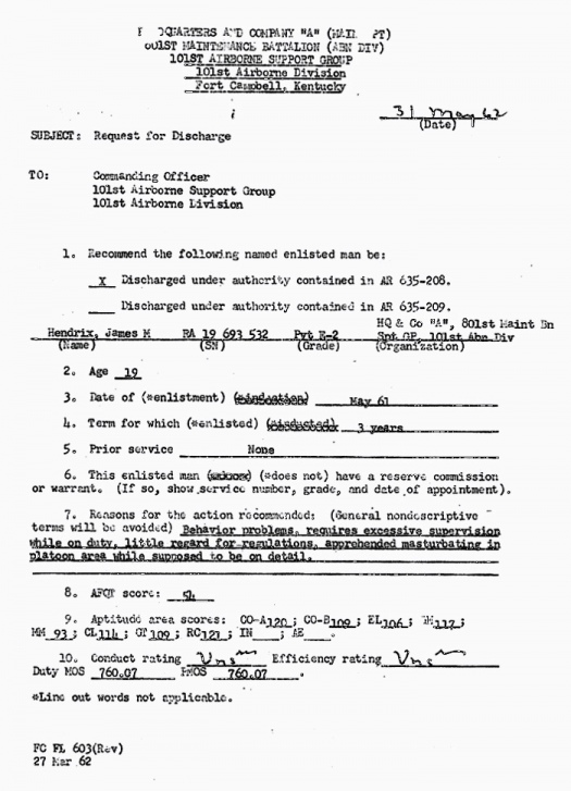 Le 2 juillet 1962 : réformé de l’armée suite à fracture de la cheville en entraînement, lors de son 26ème saut (retrouver la progression technique type de ces sauts, retrouver l’avion, retrouver les paysages). Il quitte son service avec 400 dollars en poche, et s’offre une nuit de bringue. Le lendemain, il lui en reste 16. Mais qui, ayant eu la chance d’interroger Hendrix de son vivant, aurait eu le culot de lui en demander un compte rendu détaillé, pour autant qu’il en ait eu quelque souvenir ?