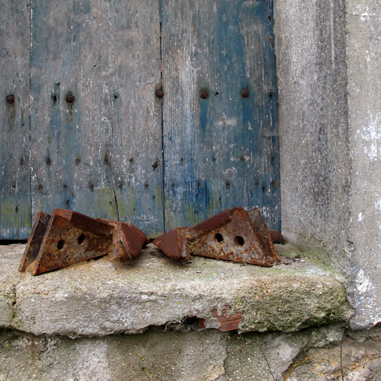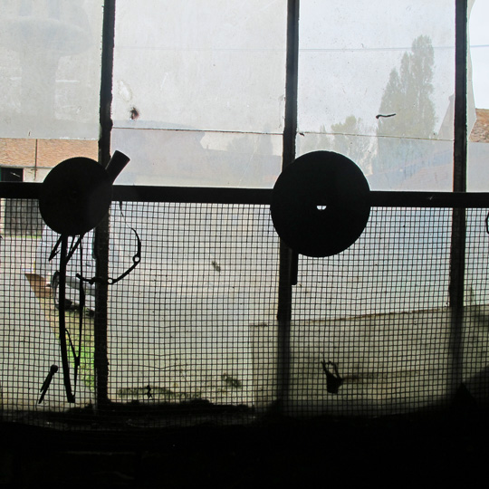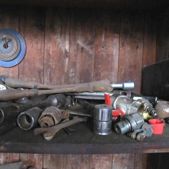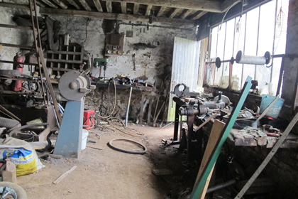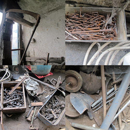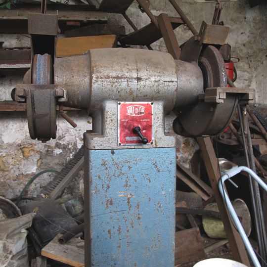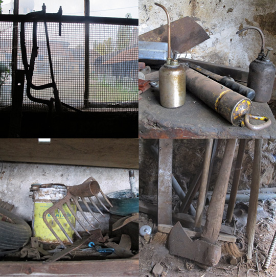 Je me prends à m’attacher à la vieille ferme des Granges, la halle majestueuse du stockage de grain, derrière le mur les rigoles qui partent pour Versailles et rappellent qu’ici on revient loin dans le passé. Les radars surplombent la vieille cour carrée. La première fois que nous y étions venus, j’avais parlé avec ce vieux monsieur qui réparait un tracteur Massey-Ferguson hors d’âge, puisque les bâtiments maintenant appartiennent aux Domaines et que la ruine s’y installe. Le vieux monsieur n’était pas là ce matin, mais son atelier restait ouvert, le poste à arc posé dans l’entrée. Je me suis permis ces images. Non pour les lui voler, mais parce qu’il n’y avait pas là une odeur, une matière et une forme qui me soient étrangères, qui ne me soient pas enfance. J’ai posé la main sur l’étau, la meule, le manche de la vieille faux. Respiré les vieux caoutchoucs de chambre à air, la graisse de la perceuse à colonne, et la rouille des clous. La terre battue du sol aussi comptait. Tout cela, je le connaissais d’avance. Rares sont les lieux que je dis ainsi nervaliens, dans la pleine acception de ce que Nerval y a laissé de vie. Et moi pour cela il me faut ces mécaniques. Hommage au vieil homme de l’atelier, salut à celles et ceux qui ont eu ici part de leur vie. Nous y exposons, du 9 à fin du mois, les travaux d’écriture réalisés avec la classe de 1ère Bac Pro Commerce de Palaiseau, bienvenue. Et vous apercevrez l’atelier, juste entre l’expo et la batteuse. Partout autour de la vieille ferme, bretelles et ronds-points, laminage de la ville, bâtiments gris qui poussent leurs franges, les cheminées et toits aperçus des centres de recherche. Que deviendra l’atelier, au temps du recouvrement ?