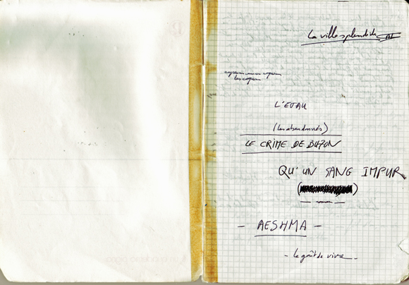 – donc j’irai à mon rythme, probablement aussi parce qu’en ce moment je suis en phase de transition et que ça m’aide de retrouver ces chantiers... hier et ce soir sont venus 2 fac-simile de cahiers pour moi importants, l’avant-écriture du Crime de Buzon (1986) et l’avant-écriture de Décor ciment (1988).