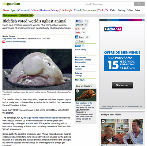 21 septembre 2013, par François Bonle prix de l’animal le plus laid parmi les espèces en danger a été attribué – source : L.A. Times & Guardian