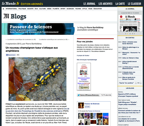 5 septembre 2013, par François Bonun champignon tueur s’attaque aux amphibiens – source : blog Passeur de Sciences