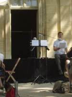 samedi 24, 10h45, à mon tour, on nous annonce l'entrée public - un mistral pas possible qui me donnera l'impression, avec le bruit du vent dans les platanes, de pousser un camion - quelques briques pour caler les textes et notes, mon vieil iBook de 3 ans d'âge une fois de plus branché sur la console, je vais improviser pendant 1h15 sur Bernard-Marie Koltès, en hommage: La Nuit juste avant les forêts, qu'il considère comme sa première pièce, a été créée à 50 mètres d'ici, hôtel des ventes de les place Crillon, par Yves Ferry, en juillet 1977, peut-être sur cette même table de bois que j'ai requise... merci à toutes celles et ceux qui étaient là pour ce partage: malgré le vent, tous les sièges pris (et merci à Valérie-Anne Expert et Clémence Bouzitat pour la SACD, à Caroline Berneaud pour le festival, des petites attentions qui changent tout, plus le célèbre Zimut et Laurent Mathias pour la régie, et la patience de Gilles Davidas pour la captation France-Culture, diffusion les samedi et dimanche 7, 8, 14 et 15 août à 20h, dans les dures conditions du faux direct...) FB, le 25/07/04