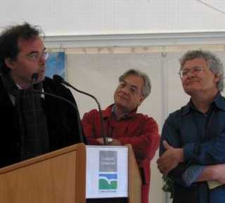 entre Gérard Brugières (conseiller livre à la DRAC Bretagne) et Yvon Le Men, c'est la poète Heather Dohollau, née en 1926 : pour retrouver un peu de son regard et de ses mots, lisez-la sur remue.net et en bleu au fond, Claudy Lebreton, président du Conseil général des Côtes d'Armor et président du jury